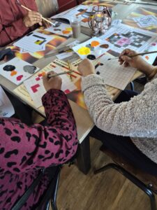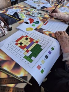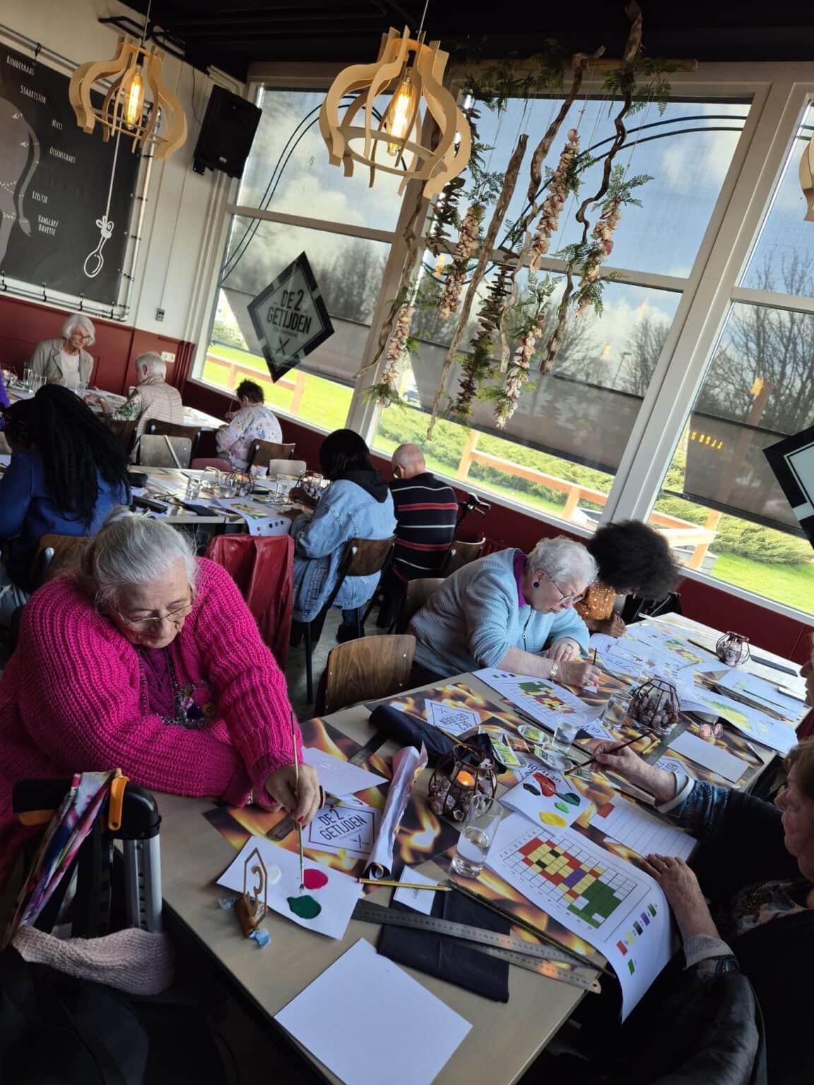 De lunch werd, zoals altijd, met zorg voorbereid en geserveerd door de leerlingen van Scholen aan Zee. Voor hen is dit niet alleen een praktijkervaring, maar ook een kans om echt iets te betekenen voor anderen. Gastvrijheid, samenwerken en sociale betrokkenheid komen hier op een bijzondere manier samen. Na de lunch was het tijd voor een verbindende activiteit, waarbij de gasten hun creativiteit de vrije loop lieten. Er werd geschilderd, getekend en met elkaar gesproken. Iedereen deed op zijn eigen manier mee.